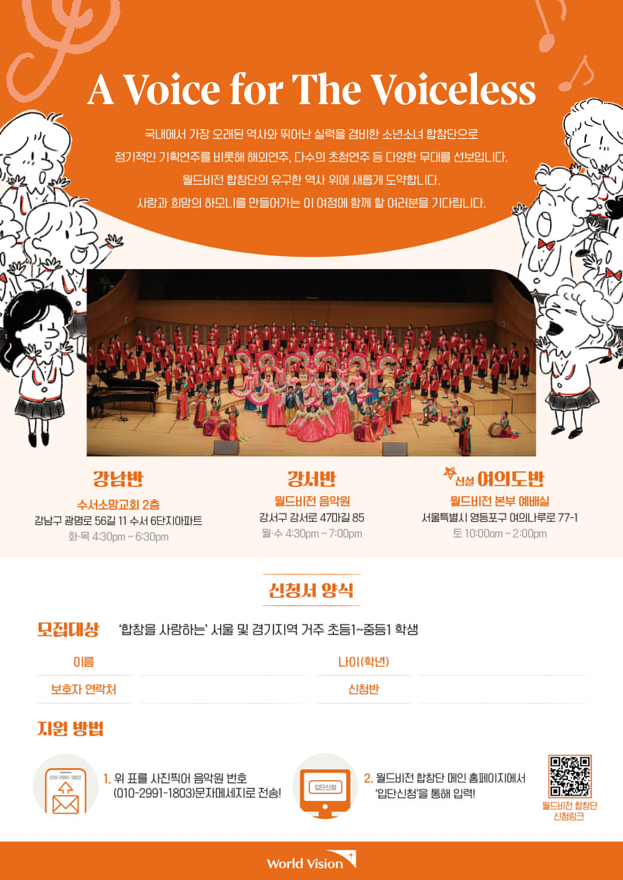 대상: 초등학교 1학년 ~ 중학교 1학년 강남반 -연습 장소: 수서소망교회 (강남구 광평로56길 11, 수서6단지아파트) -연습 시간: 화요일 · 목요일 16:30~18:30 강서반 -연습 장소: 월드비전 음악원 (강서구 강서로47마길 85) -연습 시간: 월요일 · 수요일 16:30~19:00 여의도반 -연습 장소: 월드비전 본부 (서울특별시 영등포구 여의나루로 77-1) -연습 시간: 토요일 10:00~14:00 오디션: 각 지역반 연습실 / 자유곡 1곡(악보지참) - 신청 및 문의: 월드비전 음악원(02-2662-1803) 함께 노래하며 성장할 친구들을 기다립니다!
